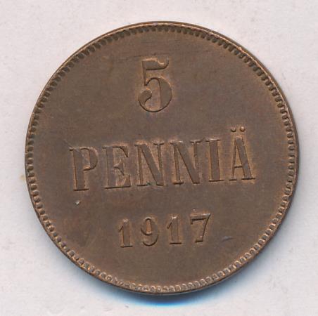 Лицевая сторона — вензель Александра II, оборотная — номинал (5 PENNIA) и дата. Нормативный вес — 6,40 грамма, гурт гладкий.