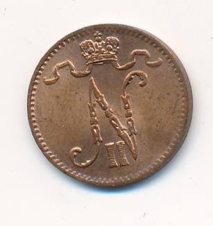 Лицевая сторона — вензель Александра II, оборотная — номинал (1 PENNIA) и дата. Нормативный вес — 1,28 грамма, гурт гладкий.