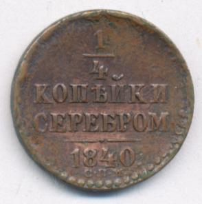 На новых монетах равенство серебряному курсу указано прямо в номинале: «1/4 КОПЕЙКИ СЕРЕБРОМ». Указ об их выпуске следует 6 сентября 1840 года («О новой медной монете на серебро 16-рублевого в пуде достоинства»). Массовая чеканка началось за год до этого на Екатеринбургском (знак ЕМ) и Сузунском (знак СМ) дворах. В качестве временной меры в 1840-1843 годах к ним подключается Ижорский завод (знак СПМ). С 1844 года после «значительного скопления медной монеты в народном обращении» в Екатеринбурге производство прекращается, а в Сузуне сокращается.