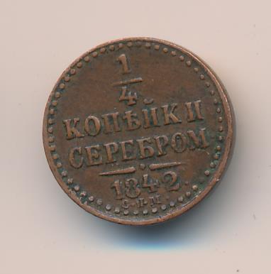 Лицевая сторона — вензель Николая I в бусовом ободке, оборотная — надпись «1/4 КОПЕЙКИ СЕРЕБРОМ» и дата. Нормативный вес — 2,56 грамма, гурт гладкий.