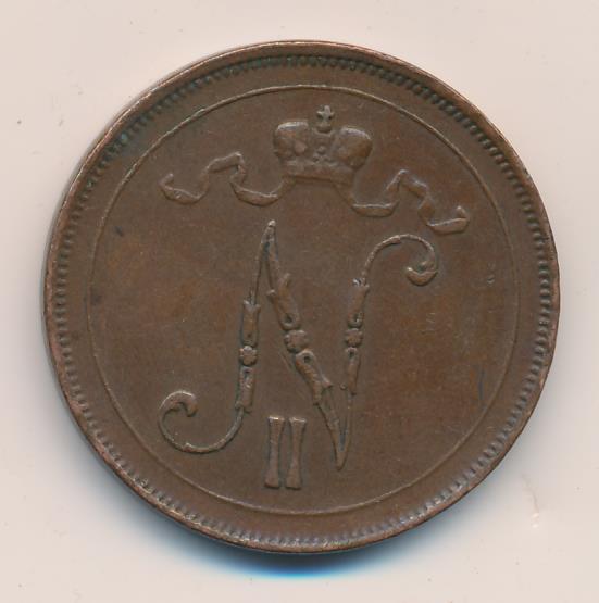 Лицевая сторона — вензель Александра II, оборотная — номинал (10 PENNIA) в венке из дубовых ветвей и дата. Нормативный вес — 12,80 грамма, гурт гладкий.