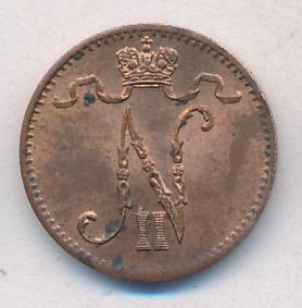 Лицевая сторона — вензель Александра II, оборотная — номинал (1 PENNIA) и дата. Нормативный вес — 1,28 грамма, гурт гладкий.