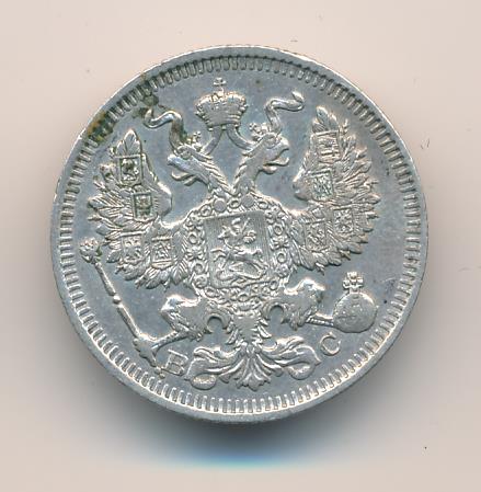 Лицевая сторона — гербовый орел, оборотная —обозначение номинала (20 копеекъ), окруженное венком из лавровой и дубовой ветвей и дата.