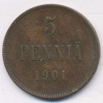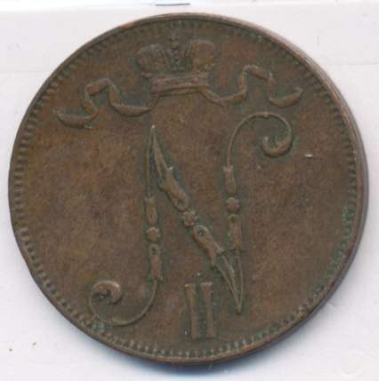 Лицевая сторона — вензель Александра II, оборотная — номинал (5 PENNIA) и дата. Нормативный вес — 6,40 грамма, гурт гладкий.