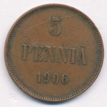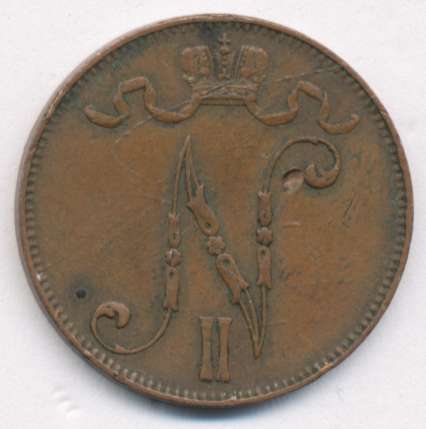 Лицевая сторона — вензель Александра II, оборотная — номинал (5 PENNIA) и дата. Нормативный вес — 6,40 грамма, гурт гладкий.