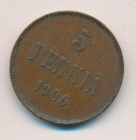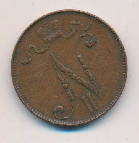 Лицевая сторона — вензель Александра II, оборотная — номинал (5 PENNIA) и дата. Нормативный вес — 6,40 грамма, гурт гладкий.