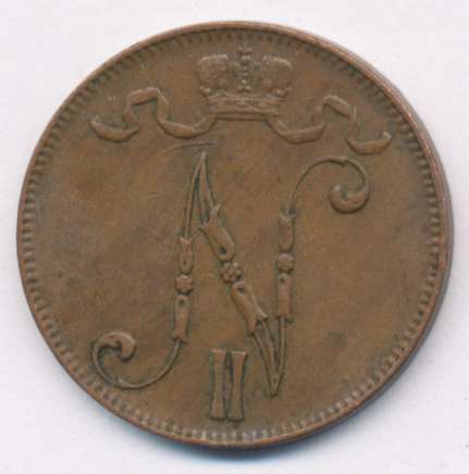 Лицевая сторона — вензель Александра II, оборотная — номинал (5 PENNIA) и дата. Нормативный вес — 6,40 грамма, гурт гладкий.