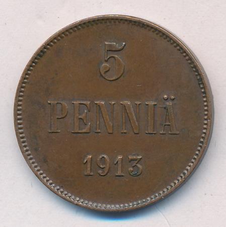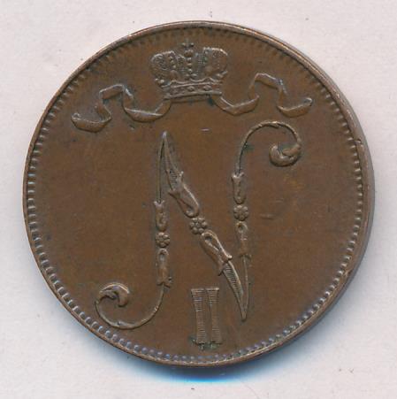 Лицевая сторона — вензель Александра II, оборотная — номинал (5 PENNIA) и дата. Нормативный вес — 6,40 грамма, гурт гладкий.