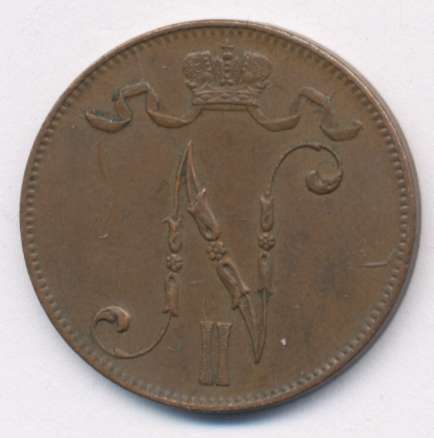 Лицевая сторона — вензель Александра II, оборотная — номинал (5 PENNIA) и дата. Нормативный вес — 6,40 грамма, гурт гладкий.