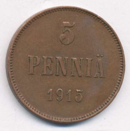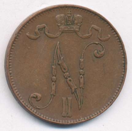 Лицевая сторона — вензель Александра II, оборотная — номинал (5 PENNIA) и дата. Нормативный вес — 6,40 грамма, гурт гладкий.