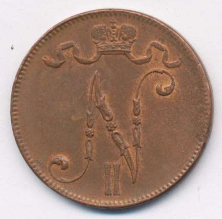Лицевая сторона — вензель Александра II, оборотная — номинал (5 PENNIA) и дата. Нормативный вес — 6,40 грамма, гурт гладкий.