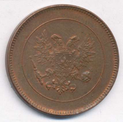 Лицевая сторона — вензель Александра II, оборотная — номинал (5 PENNIA) и дата. Нормативный вес — 6,40 грамма, гурт гладкий.