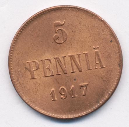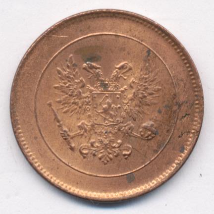 Лицевая сторона — вензель Александра II, оборотная — номинал (5 PENNIA) и дата. Нормативный вес — 6,40 грамма, гурт гладкий.