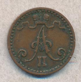 Лицевая сторона — вензель Александра II, оборотная — номинал (1 PENNIA) и дата. Нормативный вес — 1,28 грамма, гурт гладкий.