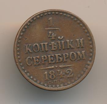 Лицевая сторона — вензель Николая I в бусовом ободке, оборотная — надпись «1/4 КОПЕЙКИ СЕРЕБРОМ» и дата. Нормативный вес — 2,56 грамма, гурт гладкий.
