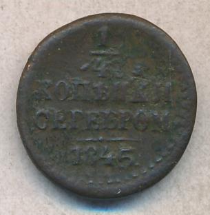 Лицевая сторона — вензель Николая I в бусовом ободке, оборотная — надпись «1/4 КОПЕЙКИ СЕРЕБРОМ» и дата. Нормативный вес — 2,56 грамма, гурт гладкий.