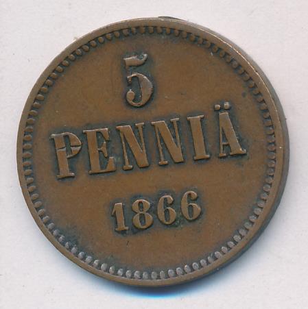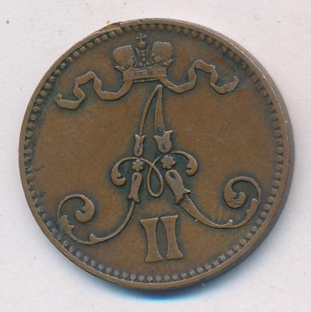 Лицевая сторона — вензель Александра II, оборотная — номинал (5 PENNIA) и дата. Нормативный вес — 6,40 грамма, гурт гладкий.