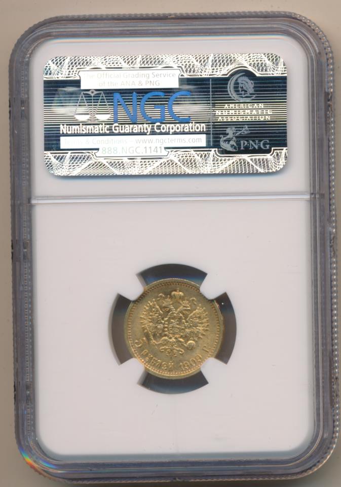 Лицевая сторона — портрет Николая II и надпись «Б.М. НИКОЛАЙ II ИМПЕРАТОРЪ И САМОДЕРЖЕЦЪ ВСЕРОСС»», оборотная — двуглавый орел, обозначение номинала (5 рублей) и дата.