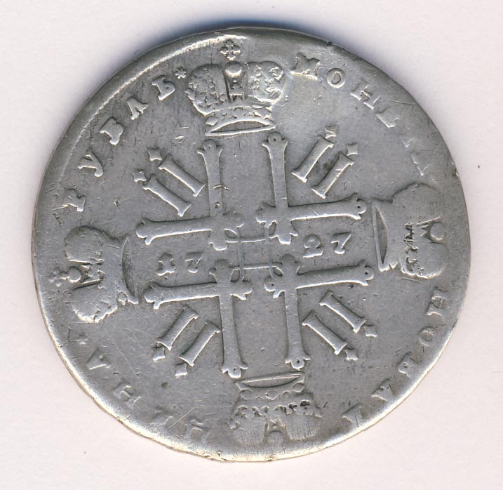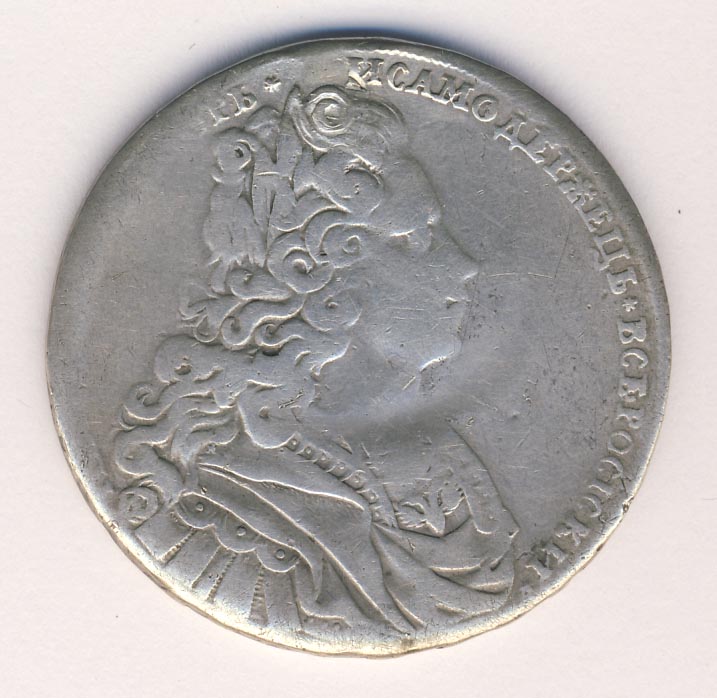Рубль 1727-1729 годов «Голова разделяет надпись»
