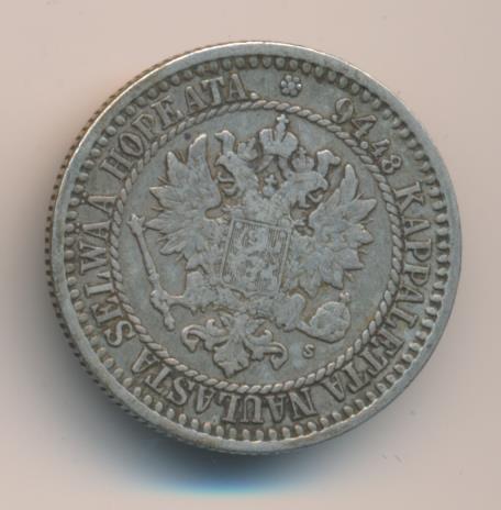 Лицевая сторона — российский двуглавый орел с гербом Великого княжества Финляндского на груди в кольцевой надписи с указанием количества штук (94,48) из фунта сплава серебра, оборотная — номинал и дата в венке из дубовых листьев. Проба — 868, нормативный вес — 5,18 грамма, гурт рубчатый.