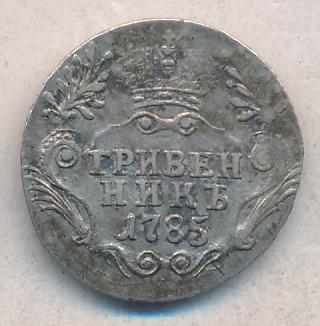 Выделяют два типа - «шея длиннее» и «шея короче». Лицевая сторона — портрет императрицы и надпись «Б М ЕКАТЕРИНА II IМП И САМОД ВСЕРОСС», оборотная — обозначение номинала (гривенникъ) и дата. Проба — 750, нормативный вес — 2,37 грамма, гурт — шнур.