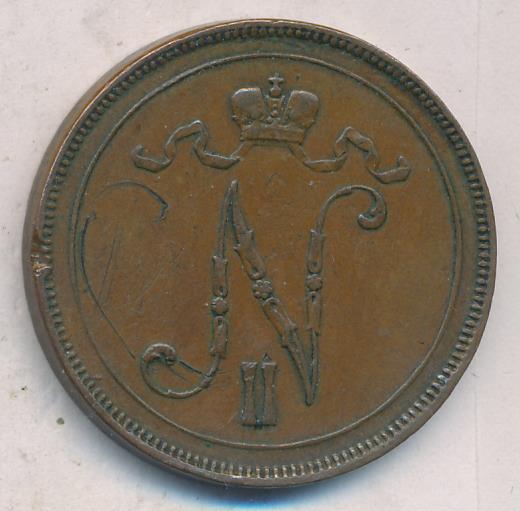 Лицевая сторона — вензель Александра II, оборотная — номинал (10 PENNIA) в венке из дубовых ветвей и дата. Нормативный вес — 12,80 грамма, гурт гладкий.