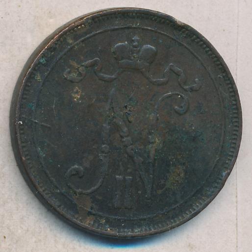 Лицевая сторона — вензель Александра II, оборотная — номинал (10 PENNIA) в венке из дубовых ветвей и дата. Нормативный вес — 12,80 грамма, гурт гладкий.