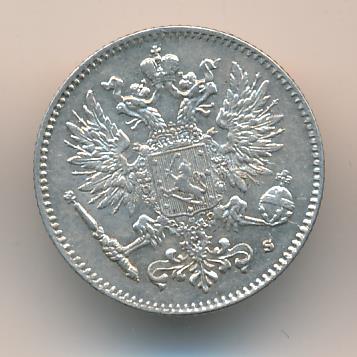 Лицевая сторона — российский двуглавый орел с гербом Великого княжества Финляндского на груди, оборотная — номинал и дата в венке из дубовых листьев. Проба — 750, нормативный вес — 2,55 грамма, гурт рубчатый.