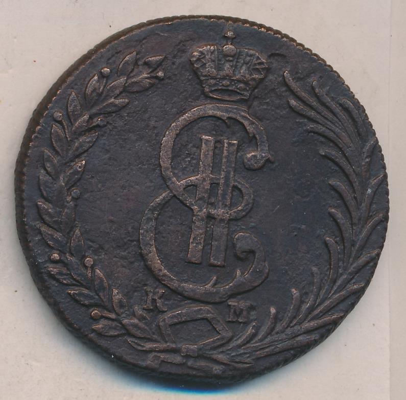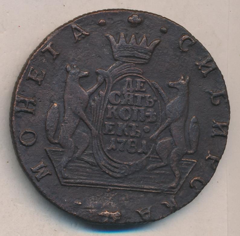 Лицевая сторона - два соболя поддерживают щит с обозначением номинала (десять копеекъ) под короной, надпись «СИБИРСКАЯ МОНЕТА». Оборотная — вензель Екатерины II в венке из пальмовой и лавровой ветвей. Вес — 65, 52 грамма. Нормативный вес — 65,52 грамма, это самая увесистая медная монета регулярного чекана в истории российской нумизматики. Гурт — надпись «колыванская медь» или шнур.