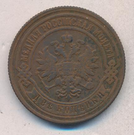 Лицевая сторона — двуглавый орел, надпись МЕДНАЯ РОССIЙСКАЯ МОНЕТА и обозначение номинала (две копейки); оборотная — обозначение номинала (2 копейки) в бусовом ободке и дата. Нормативный вес — 6,55 грамма, гурт рубчатый.