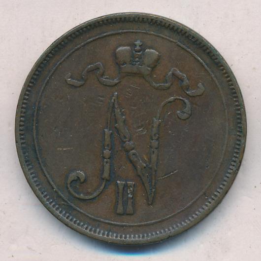 Лицевая сторона — вензель Александра II, оборотная — номинал (10 PENNIA) в венке из дубовых ветвей и дата. Нормативный вес — 12,80 грамма, гурт гладкий.