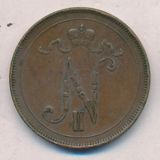 Лицевая сторона — вензель Александра II, оборотная — номинал (10 PENNIA) в венке из дубовых ветвей и дата. Нормативный вес — 12,80 грамма, гурт гладкий.