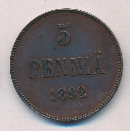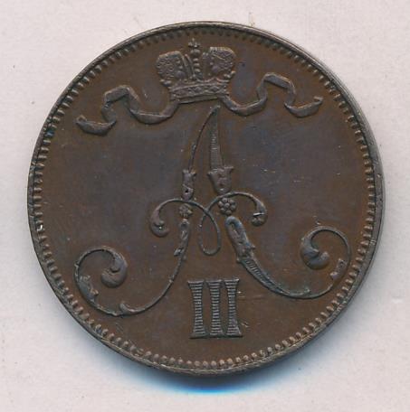 Лицевая сторона — вензель Александра II, оборотная — номинал (5 PENNIA) и дата. Нормативный вес — 6,40 грамма, гурт гладкий.