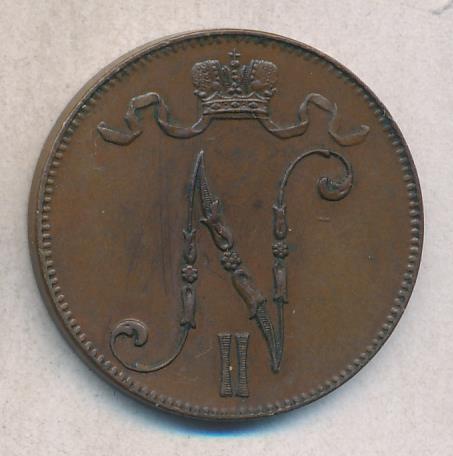 Лицевая сторона — вензель Александра II, оборотная — номинал (5 PENNIA) и дата. Нормативный вес — 6,40 грамма, гурт гладкий.