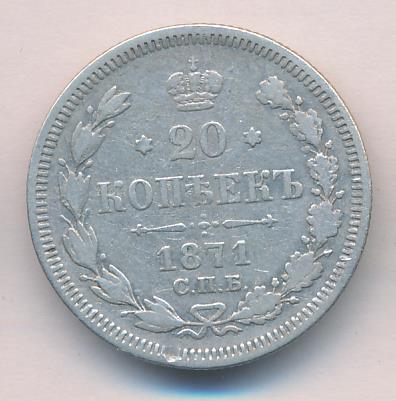 Лицевая сторона — гербовый орел, оборотная —обозначение номинала (20 копеекъ), окруженное венком из лавровой и дубовой ветвей и дата.