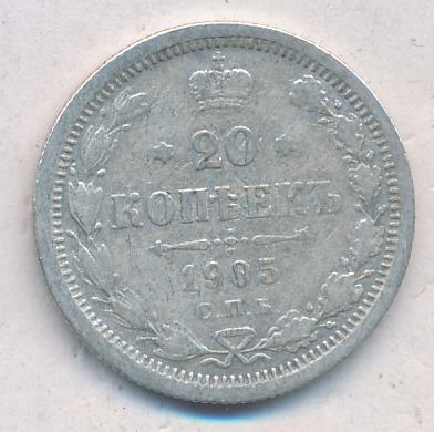 Лицевая сторона — гербовый орел, оборотная —обозначение номинала (20 копеекъ), окруженное венком из лавровой и дубовой ветвей и дата.