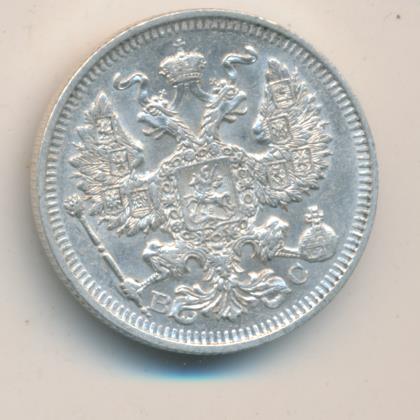 Лицевая сторона — гербовый орел, оборотная —обозначение номинала (20 копеекъ), окруженное венком из лавровой и дубовой ветвей и дата.