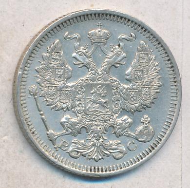 Лицевая сторона — гербовый орел, оборотная —обозначение номинала (20 копеекъ), окруженное венком из лавровой и дубовой ветвей и дата.