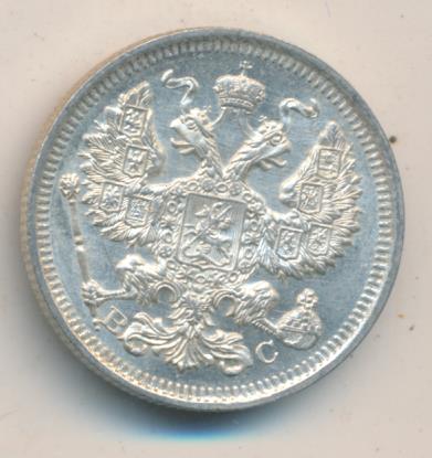 Лицевая сторона — гербовый орел, оборотная —обозначение номинала (20 копеекъ), окруженное венком из лавровой и дубовой ветвей и дата.