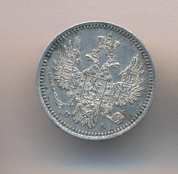 Лицевая сторона — новый гербовый орел с поднятыми крыльями, оборотная —обозначение номинала (5 копеекъ), окруженное венком из лавровой и дубовой ветвей и дата. Проба — 868, нормативный вес — 1,04 грамма.