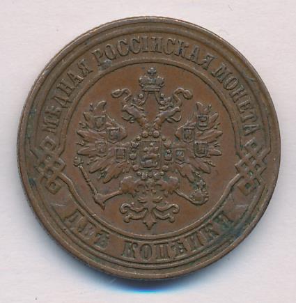 Лицевая сторона — двуглавый орел, надпись МЕДНАЯ РОССIЙСКАЯ МОНЕТА и обозначение номинала (две копейки); оборотная — обозначение номинала (2 копейки) в бусовом ободке и дата. Нормативный вес — 6,55 грамма, гурт рубчатый.