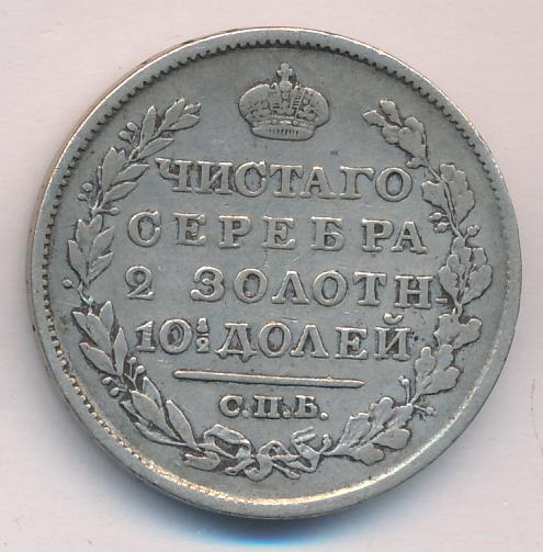 Лицевая сторона - двуглавый орел, дата и надпись «МОНЕТА РУБЛЬ», оборотная — окруженная венком из лавровой и дубовой ветвей надпись «ЧИСТАГО СЕРЕБРА 2 ЗОЛОТН 10 ДОЛЕЙ». Проба — 868, нормативный вес — 10,37 грамма.