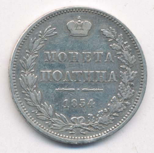 Лицевая сторона — новый гербовый орел с поднятыми крыльями и надпись «ЧИСТОГО СЕРЕБРА 2 ЗОЛОТНИКА 10 ДОЛЕЙ», оборотная — надпись «МОНЕТА ПОЛТИНА», окруженная венком из лавровой и дубовой ветвей и дата.