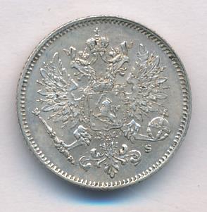 Лицевая сторона — российский двуглавый орел с гербом Великого княжества Финляндского на груди, оборотная — номинал и дата в венке из дубовых листьев. Проба — 750, нормативный вес — 1,27 грамма, гурт рубчатый.