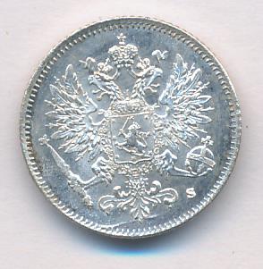 Лицевая сторона — российский двуглавый орел с гербом Великого княжества Финляндского на груди, оборотная — номинал и дата в венке из дубовых листьев. Проба — 750, нормативный вес — 1,27 грамма, гурт рубчатый.