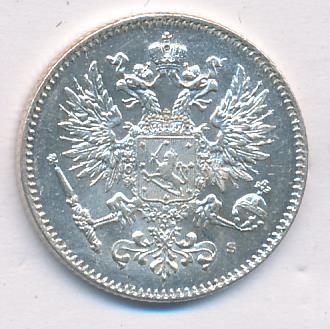 Лицевая сторона — российский двуглавый орел с гербом Великого княжества Финляндского на груди, оборотная — номинал и дата в венке из дубовых листьев. Проба — 750, нормативный вес — 2,55 грамма, гурт рубчатый.