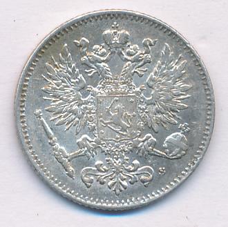 Лицевая сторона — российский двуглавый орел с гербом Великого княжества Финляндского на груди, оборотная — номинал и дата в венке из дубовых листьев. Проба — 750, нормативный вес — 2,55 грамма, гурт рубчатый.