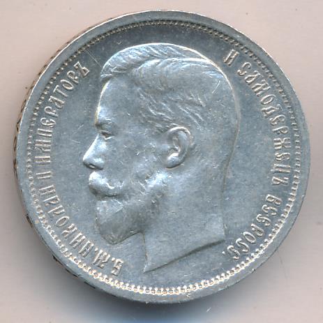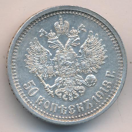 Лицевая сторона — портрет Николая II в круговой надписи «Б.М. НИКОЛАЙ II ИМПЕРАТОРЪ И САМОДЕРЖЕЦЪ ВСЕРОСС», оборотная — двуглавый орел, обозначение номинала (50 копеекъ) и дата.
