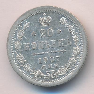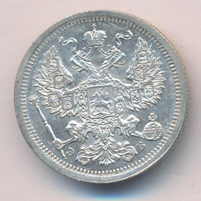 Лицевая сторона — гербовый орел, оборотная —обозначение номинала (20 копеекъ), окруженное венком из лавровой и дубовой ветвей и дата.