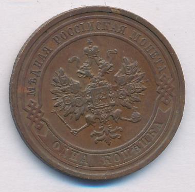 Лицевая сторона — двуглавый орел, надпись МЕДНАЯ РОССIЙСКАЯ МОНЕТА и обозначение номинала (одна копейка); оборотная — обозначение номинала (1 копейка) в бусовом ободке и дата. Нормативный вес — 3,28 грамма, гурт рубчатый.